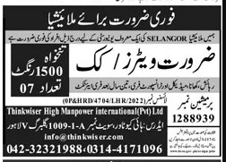 Thinkwiser High Manpower International Pvt Ltd Malaysia, malaysia Malaysia invites applications from eligible candidates for the post of waiter and cook as per advertisement of October 28, 2022 published in daily Jang Newspaper. Middle, Intermediate, Primary and Matric etc. educational qualification will be preferred.