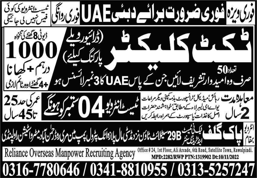 Pak Gulf Tec Ni Test & Training Center jobs advertisement dated about 31 August 2023 in daily Express Newspaper invites application for the vacant post of driver, driver valet parking and ticket collector in Abu Dhabi, dubai UAE. Intermediate and Matric etc. educational qualification will be preferred.