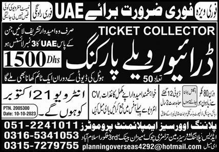 Planning Oversaeas Employment Promoters jobs advertisement dated about 18 October 2023 in daily Express Newspaper invites application for the vacant post of driver, ticket collector and driver valet parking in Abu Dhabi, sharjah UAE. Intermediate and Matric etc. educational qualification will be preferred.