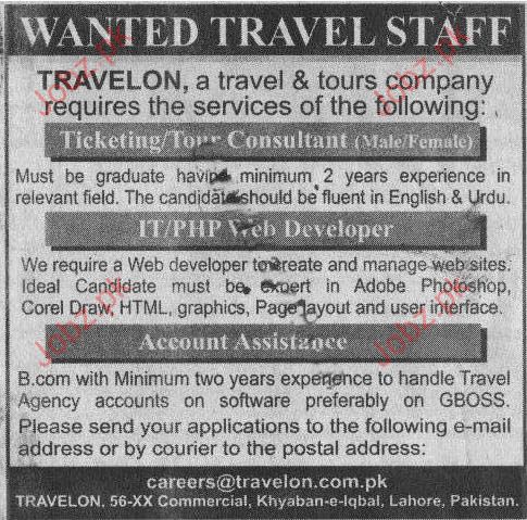 Ticketing / Tour Consultant, PHP Web Developer Jobs