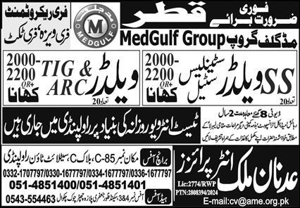 Adnan Malik Enterprises jobs advertisement dated about 20 August 2024 in daily Express Newspaper invites application for the vacant post of tig welder, arc welder, ss welder, welder and stainless steel welder in Doha, doha Qatar. Educational qualifications required Matric and Intermediate etc.