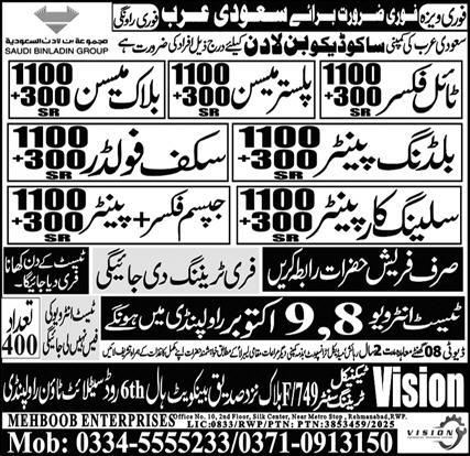 Vision Technical Training Center is looking for candidates for following posts as per job advertisement published in daily Express Newspaper of October 8, 2025 for location Jeddah, dammam Saudi Arabia: