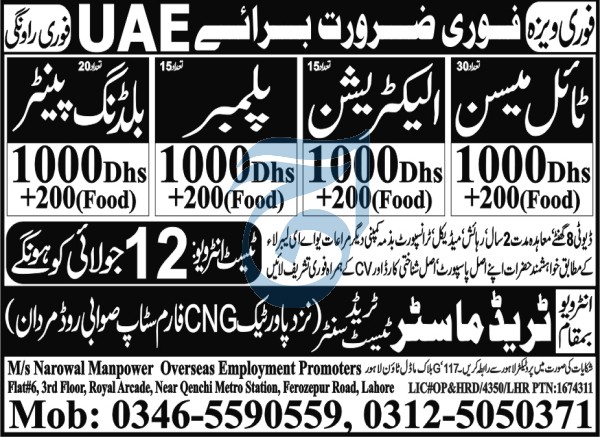 Ms Narowal Manpower Overseas Employment Promoters is looking for candidates for following posts as per job advertisement published in daily Aaj Newspaper of July 7, 2023 for location Abu Dhabi, abu dhabi UAE: