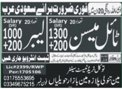 Vacant posts including tile mason and labor are announced in Tawakal Trade Test Center Riyadh, riyadh Saudi Arabia as per 12 July 2023 advertisement in daily Aaj Newspaper. Middle etc. educational qualification will be preferred.