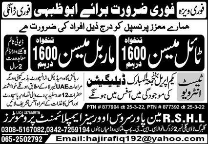 RSHL Manpower Service Overseas Employment Promoter is looking for candidates for following posts as per job advertisement published in daily Express Newspaper of March 31, 2022 for location Abu Dhabi, abu dhabi UAE: