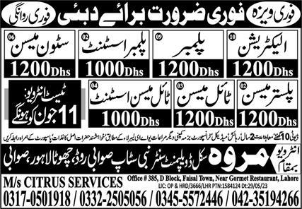 Marwa Skill Development Center Dubai, abu dhabi Dubai invites applications from eligible candidates for the post of plumber assistant, tile mason assistant, plaster mason, plumber, stone mason, electrician and tile mason as per advertisement of June 6, 2023 published in daily Express Newspaper. Candidates with Matric and Intermediate etc. educational background will be preferred.