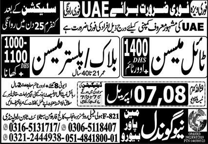 New Gondal Manpower Bureau Abu Dhabi, sharjah UAE invites applications from eligible candidates for the post of plaster mason, tile mason and block mason as per advertisement of April 5, 2023 published in daily Express Newspaper. Persons with Matric etc. education can apply.