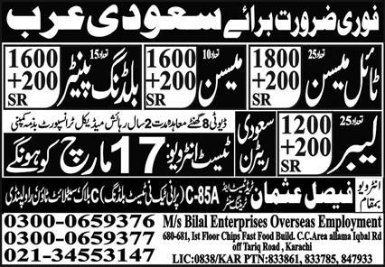 MS Bilal Enterprises Overseas Employment invites applications for job positions advertised in daily Express dated 17 March 2022 for following vacancies in Jeddah, jeddah Saudi Arabia.