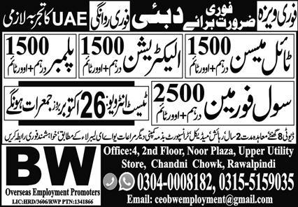 BW Overseas Employment Promoters jobs advertisement dated about 24 October 2023 in daily Express Newspaper invites application for the vacant post of civil foreman, plumber, tile mason and electrician in Dubai, dubai Dubai. Persons with Bachelor, DAE, Matric and Intermediate etc. education can apply.