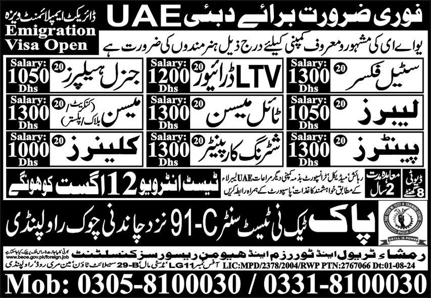 Rimsha Travels Tourism & Human Resources Consultant Dubai, abu dhabi Dubai invites applications from eligible candidates for the post of concrete mason, driver, tile mason, block mason, blaster mason, painter, ltv driver, labor, general helper, cleaner, steel fixer, shuttering carpenter and mason as per advertisement of August 7, 2024 published in daily Express Newspaper. Persons with Matric, Middle and Intermediate etc. education can apply.