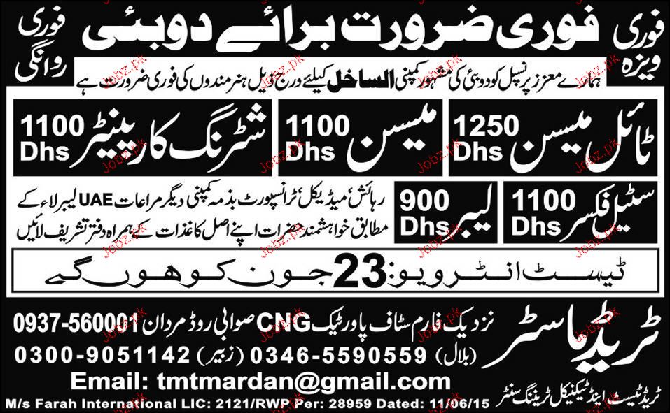 Tile Mason, Helper Steel Fixers, Labors Job Opportunity