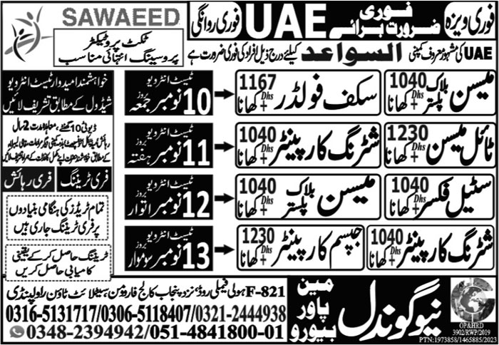 Vacant posts including Shuttering Carpenter, Block Mason, Mason, Plaster Mason, Gypsum Carpenter, Steel Fixer, Tile Mason and Scaffolder are announced in New Gondal Manpower Bureau UAE, uae UAE as per 9 November 2023 advertisement in daily Roznama 92 News Newspaper. Educational qualifications required Bachelor, Intermediate, DAE and Matric etc.