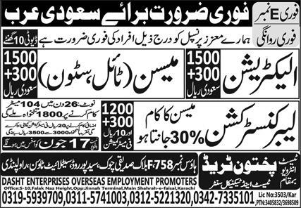 Pakhtoon Trade Test & Technical Center is looking for candidates for following posts as per job advertisement published in daily Express Newspaper of June 14, 2025 for location Dammam, tabuk Saudi Arabia: