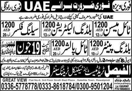 Al Faisal Trade Test & Technical Training Center jobs advertisement dated about 16 June 2023 in daily Express Newspaper invites application for the vacant post of building electrician, building painter, tile polisher, tile mason and ceiling fixer in Abu Dhabi, dubai UAE. Preferred Education is Matric and Intermediate etc.