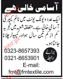 Apply as per details in job advertisement. Login to view further details of how to apply via https://www.jobz.pk online.