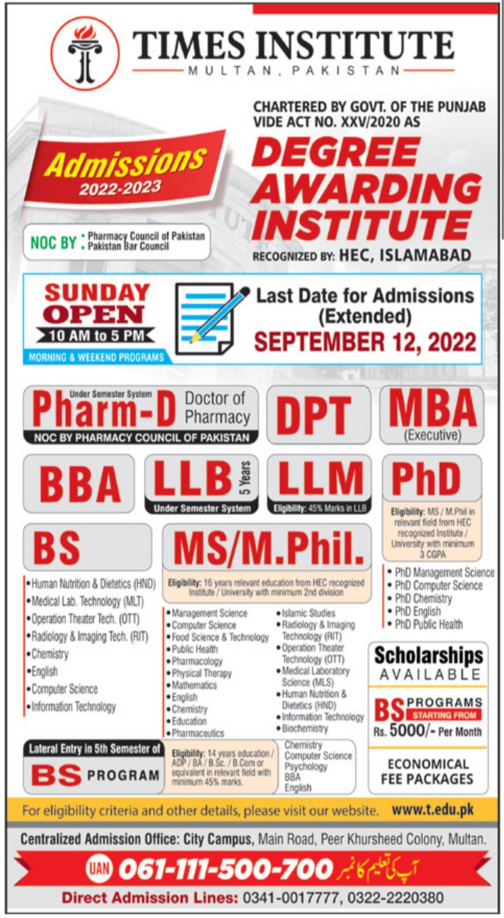 Times Institute Doctor of Pharmacy Diploma, Pharma-D, Master of Business Administration Executive MBA, Bachelor of Business Administration BBA, LLB 5 Years, LLM, PhD, Bachelor of Science Human Nutrition and Dietetics, Medical Lab-Technology, Operation Theatre Tech, Radiology and Imaging Tech, Chemistry, English Computer Science, Information Technology. Master of Science and MPhil Management Science, Computer Science, Food Science and Technology, Public Health, Pharmacology, Physical Therapy, Mathematics, English, Pharmaceutics, Islamic Studies, Radiology and Imaging Technology. admissions 2022 has been announced. Eligible students can apply for academic admissions 2022 in Times Institute Multan Punjab Pakistan for Teaching Phd. Eligible candidates for admissions in BBA, Course, LLb, BS, LLM, Mphil, Diploma, Bachelor, Master, MBA, Phd and MS can apply as per Private institute criteria and before closing date 12 September 2022 after reading advertisement online. Read newspaper ad for exact details.