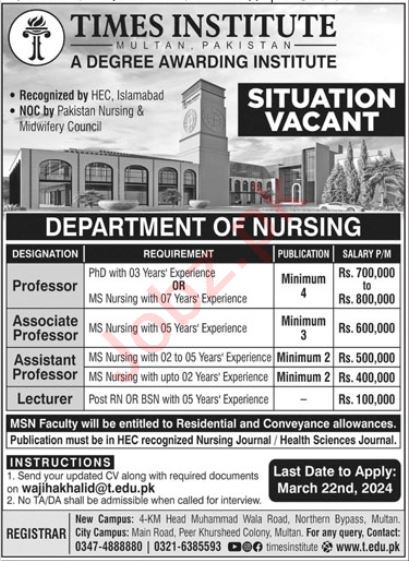 Times Institute is looking for candidates for following posts as per job advertisement published in daily Jang Newspaper of March 10, 2024 for location Multan, multan Punjab Pakistan: