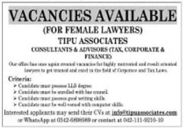 Tipu Associates jobs advertisement dated about 17 October 2024 in daily Other Newspaper invites application for the vacant post of female lawyer, advisor and consultant in Lahore, lahore Punjab Pakistan. Preferred Education is LLb and Bachelor etc.