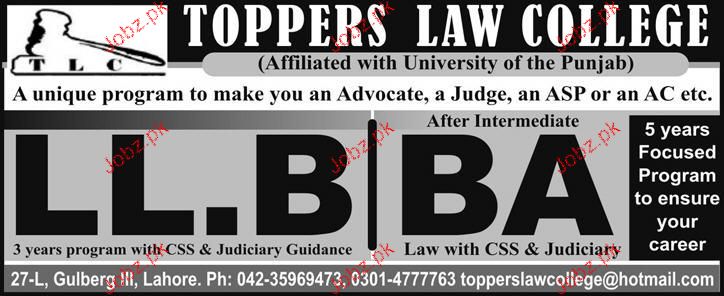 Toppers Law College Admission in LLB and BA in Lahore. Read newspaper ad for exact details.
