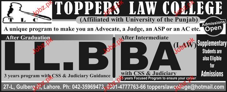 Toppers Law College Admission in LLB and BA in Lahore. Read newspaper ad for exact details.