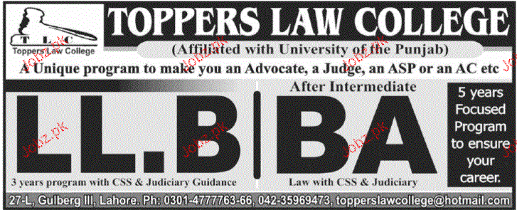 Toppers Law College Admission in LLB and BA in Lahore. Read newspaper ad for exact details.