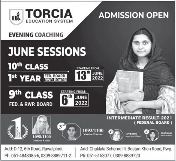 Torcia Education System has announced admissions 2022 for 9th Class, 10 Class, Matric, Intermediate, 1st Year. Eligible students can apply for academic admissions 2022 in Torcia Education System Islamabad Islamabad Pakistan for Science College. Eligible students for fulfilling criteria for admissions in Matric and Intermediate can enroll as per Private admission policy 2022 till closing date 8 June 2022. Read newspaper ad for exact details.