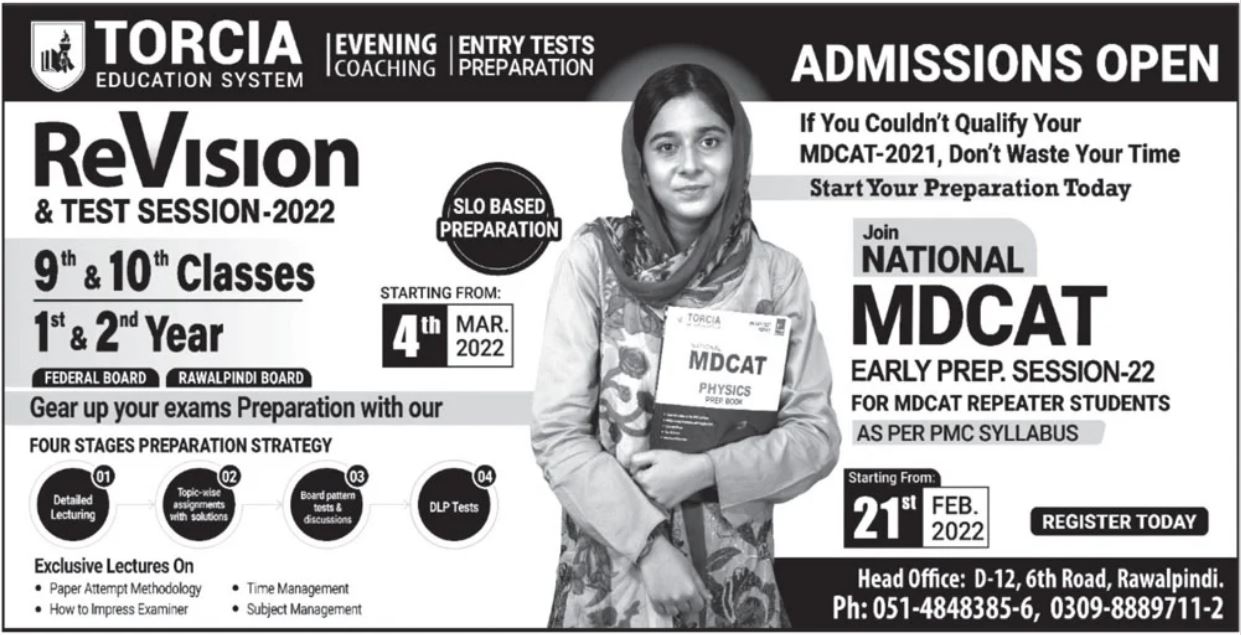 Torcia Education System Revision & Test Session 9th & 10th Classes, 1st & 2nd Year Classes admissions 2022 has been started. Torcia Education System Rawalpindi Punjab Pakistan welcomes students to apply for admissions in academic year 2022 in Teaching College. Students for admissions in Intermediate and Matric & criteria can apply as per Private institute admission policy 2022 before closing date March 5, 2022 as per advertisement. Read newspaper ad for exact details.