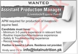 Vacant posts including assistant production manager are announced in Total Nutrition Pvt Limited Lahore, lahore Punjab Pakistan as per 17 March 2024 advertisement in daily Jang Newspaper. Master, Bachelor and MS etc. educational qualification will be preferred.
