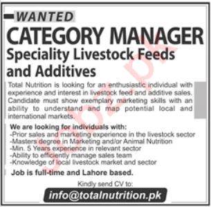 Total Nutrition Pvt Limited Lahore, lahore Punjab Pakistan invites applications from eligible candidates for the post of category manager as per advertisement of January 26, 2025 published in daily Jang Newspaper. Educational qualifications required Master, MS and Bachelor etc.