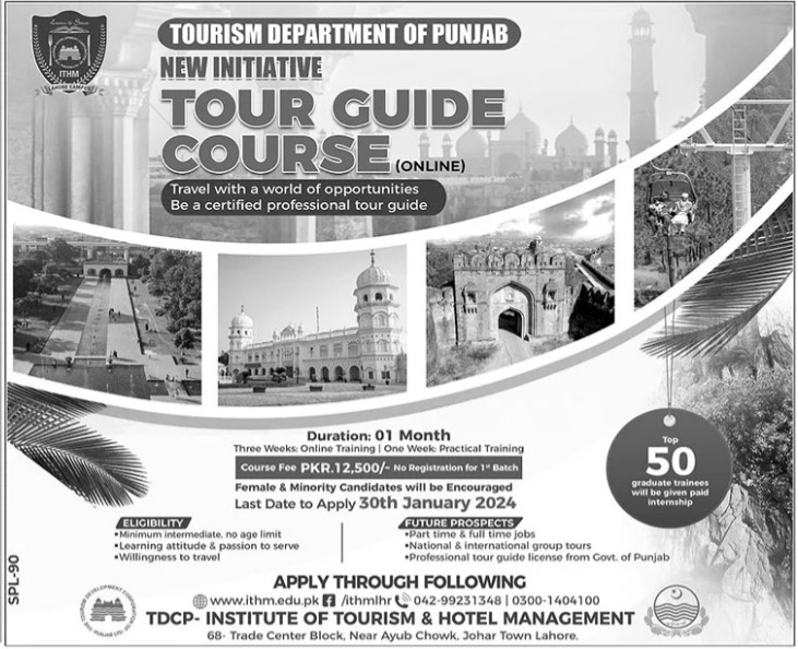 Admissions in TDCP Institute of Tourism & Hotel Management 2024 for Tour Guide Course has been announced. Students who want to take admissions in TDCP Institute of Tourism & Hotel Management Lahore Punjab Pakistan for academic year 2024 to continue education in Management Course can apply. Students for admissions in Course can apply for online or campus classes as per Private institute criteria till admission closing date January 30, 2024. Read newspaper ad for exact details.