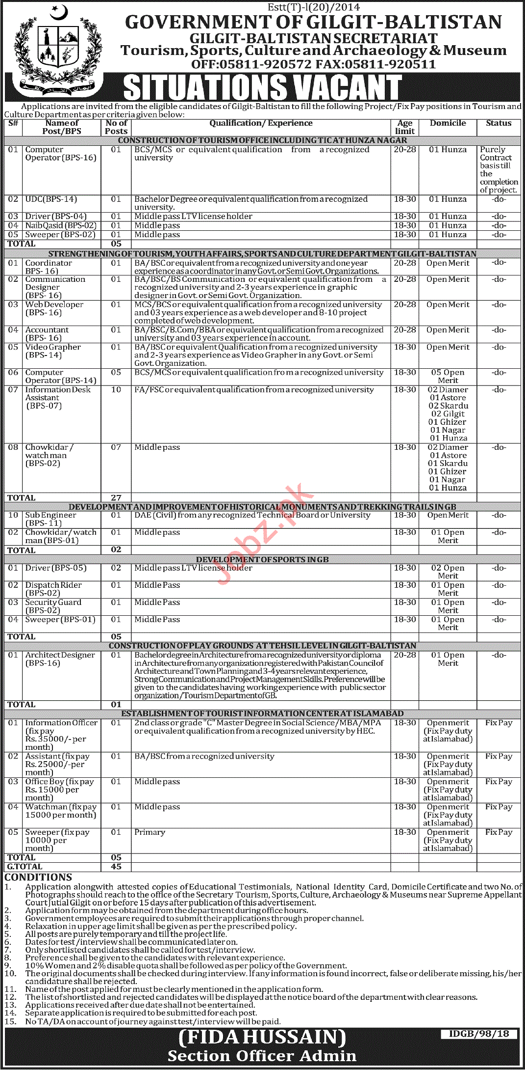 Tourism & Culture Department Gilgit, Gilgit Baltistan Secretariat, Government of Gilgit Baltistan looks individuals for the posts of Deputy Director Languages, Deputy Director Arts & Culture, Research Officer Languages & Dictionary, Publications Officer, Research Officer Arts & Culture, Accountant, Computer Operator, Research Assistant, Cashier, LTV Driver, Watchman and Naib Qasid.