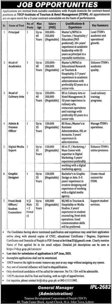 Tourism Development Corporation Punjab invites applications for job positions advertised in daily The News dated 18 June 2025 for following vacancies in Lahore, lahore Punjab Pakistan.