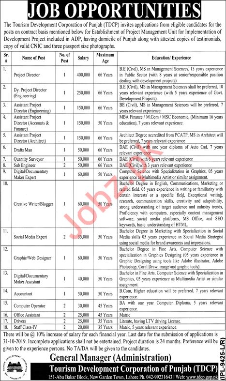 The Tourism Development Corporation of Punjab TDCP invites applications from qualified and dedicated persons for the posts of Project Director, Deputy Project Director Engineering, Assistant Accounts Project Director, Assistant Project Director Finance, Assistant Project Director Architect, Draftsman, Quantity Surveyor, Sub Engineer, Digital Expert, Documentary Maker Expert, Writer, Blogger, Social Media Expert, Graphic Designer, Web Designer, Documentary Maker Assistant, Accountant, Computer Operator, Assistant, LTV Driver and Sanitary Worker in Lahore.