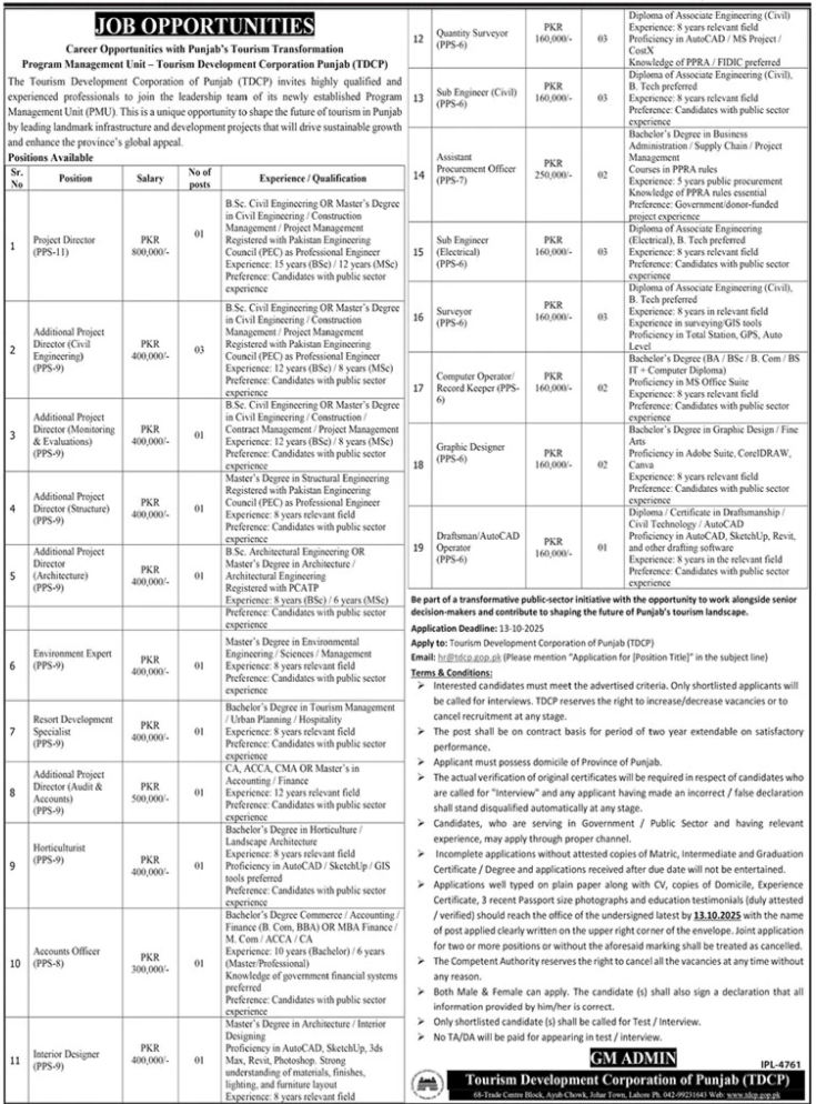 Tourism Development Corporation of Punjab TDCP jobs advertisement dated about 25 September 2025 in daily The News Newspaper invites application for the vacant post of assistant procurement officer, additional project director accounts, interior designer, environment expert, project director, computer operator, draftsman, additional project director evaluation, assistant project director, autocad operator, graphic designer, additional project director audit, additional project director monitoring, sub engineer electrical, assistant project director civil engineering, quantity surveyor, sub engineer, horticulturist, resort development specialist, additional project director, additional project director structure, additional project director architecture, sub engineer civil, record keeper, accounts officer and surveyor in Johar Town Lahore, lahore Punjab Pakistan. ACCA, M.com, B.E, Master, MBA, Bachelor, Others, BBA, CA, DAE, Intermediate, B.com and BA etc. educational qualification will be preferred.