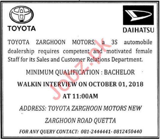 Vacancies in Toyota Zarghoon Motors Advertisement September 2018