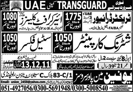 Union Manpower Services Abu Dhabi, sharjah UAE invites applications from eligible candidates for the post of aircraft cleaner, tractor driver, shuttering carpenter and steel fixer as per advertisement of July 10, 2024 published in daily Express Newspaper. Intermediate, Middle and Matric etc. educational qualification will be preferred.