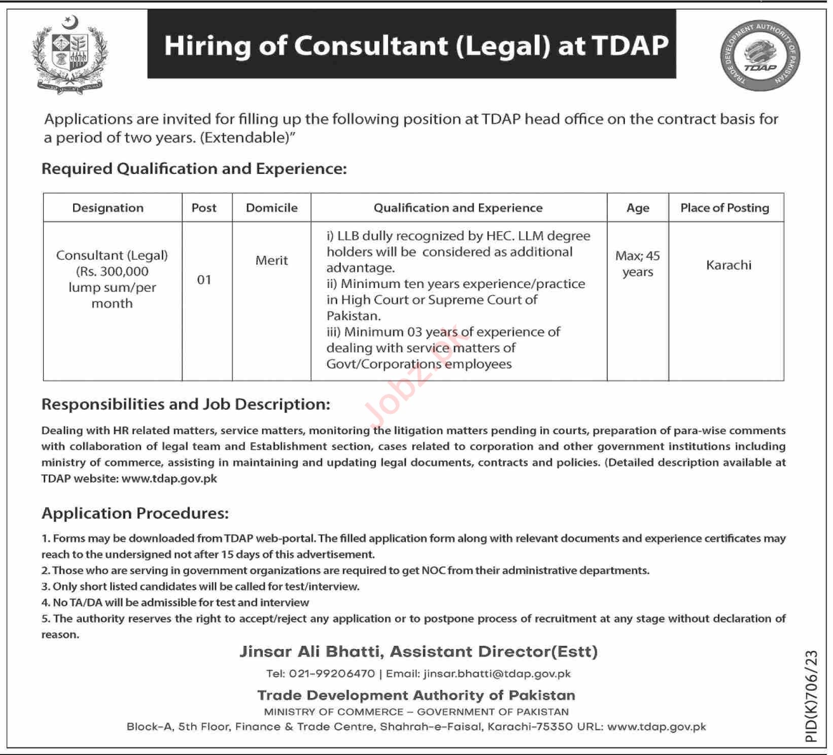 Vacant posts including consultant legal are announced in Trade Development Authority of Pakistan Karachi, karachi Sindh Pakistan as per 3 September 2023 advertisement in daily Dawn Newspaper. Candidates with LLb etc. educational background will be preferred.