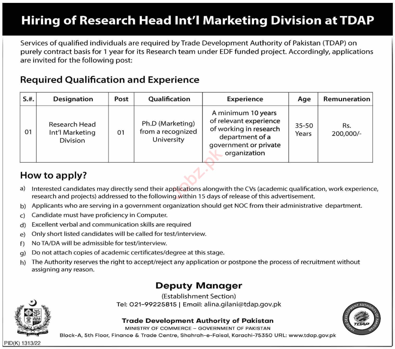 Vacant posts including research head international marketing division are announced in Trade Development Authority of Pakistan Karachi, karachi Sindh Pakistan as per 14 November 2022 advertisement in daily Dawn Newspaper. Educational qualifications required Phd and Mphil etc.