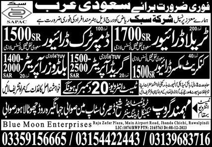 Vacant posts including dumper truck driver, traila driver, greeder operator, buildozer operator and concrete mixer driver are announced in Blue Moon Enterprises Riyadh, riyadh Saudi Arabia as per 15 December 2023 advertisement in daily Express Newspaper. Middle, Matric and Intermediate etc. educational qualification will be preferred.