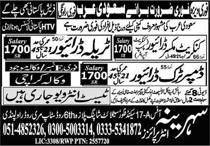 Sehrina Enterprises Riyadh, riyadh Saudi Arabia invites applications from eligible candidates for the post of concrete mixer driver, dumper truck driver and traila driver as per advertisement of August 21, 2024 published in daily Express Newspaper. Persons with Middle etc. education can apply.