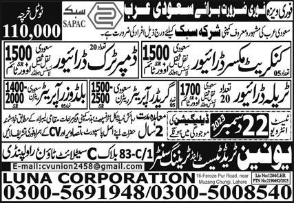 Luna Corporation jobs advertisement dated about 19 December 2023 in daily Express Newspaper invites application for the vacant post of grid operator, traila driver, dumper truck driver, concrete mixer driver and buildozer operator in Riyadh, riyadh Saudi Arabia. Educational qualifications required Middle, Matric and Intermediate etc.