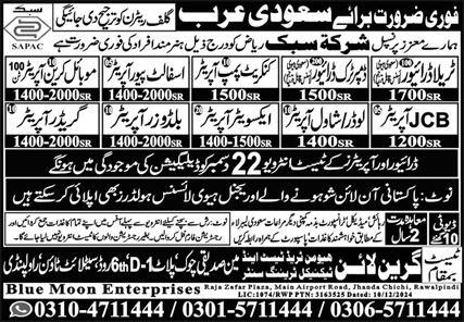 Blue Moon Enterprises Riyadh, riyadh Saudi Arabia invites applications from eligible candidates for the post of shovel operator, buildozer operator, jcb operator, concrete pump operator, greeder operator, dumper truck driver, traila driver, asphalt pever operator, mobile crane operator, excavator operator and loader operator as per advertisement of December 21, 2024 published in daily Express Newspaper. Matric, Intermediate and Middle etc. educational qualification will be preferred.