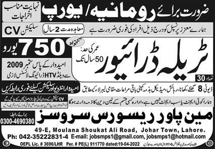 Vacant posts including traila driver, driver and htv driver are announced in Manpower Resource Services Romania, romania Romania as per 29 April 2022 advertisement in daily Express Newspaper. Preferred Education is Intermediate and Matric etc.