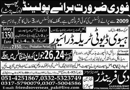 The Friends Overseas Service latest Overseas Driving jobs and others can be applied till June 26, 2023 or as per closing date in newspaper ad. Read complete ad online to know how to apply on latest The Friends Overseas Service job opportunities. Learn today extra skills including Driving and English (UK) to get these The Friends Overseas Service jobs. Salary varies from 412000. Earn more by overtime. Free accommodation, transport and medical may be available.