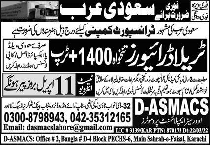 D ASMACS Overseas Jeddah, jeddah Saudi Arabia invites applications from eligible candidates for the post of htv driver, driver and traila driver as per advertisement of April 9, 2022 published in daily Express Newspaper. Persons with Intermediate, Matric and Middle etc. education can apply.