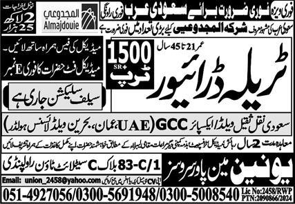 Union Manpower Services jobs advertisement dated about 4 June 2024 in daily Express Newspaper invites application for the vacant post of driver, traila driver and htv driver in Riyadh, dammam Saudi Arabia. Intermediate and Matric etc. educational qualification will be preferred.