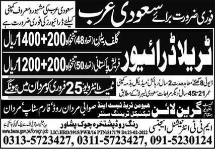Apply at Green Line Human Resources Power latest Overseas jobs in Driving and departments before closing date which is around February 25, 2022 or as per closing date in newspaper ad. Read complete ad online to know how to apply on latest Green Line Human Resources Power job opportunities. Salary varies from 76000. Earn more by overtime. Facilities like accommodation, transport and medical may be provided.
