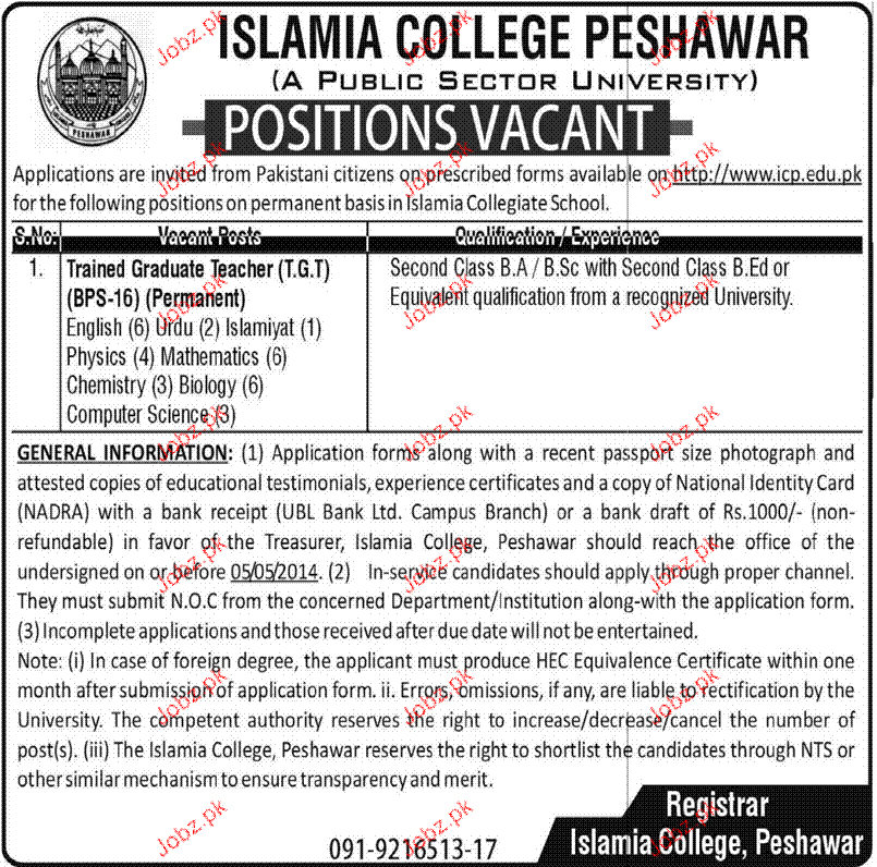 Apply as per details in job advertisement. Login to view further details of how to apply via https://www.jobz.pk online.