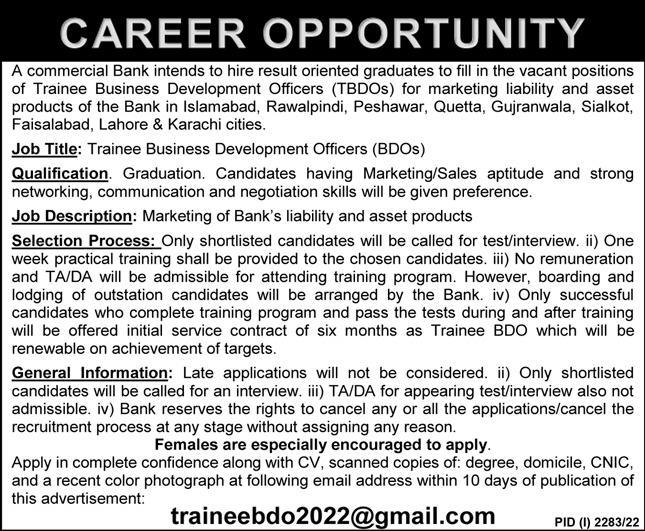 Commercial Bank invites applications for job positions advertised in daily Express dated 12 October 2022 for following vacancies in Rawalpindi, karachi, lahore, gujranwala, quetta, faisalabad, sialkot, islamabad, peshawar and rawalpindi Punjab Pakistan.