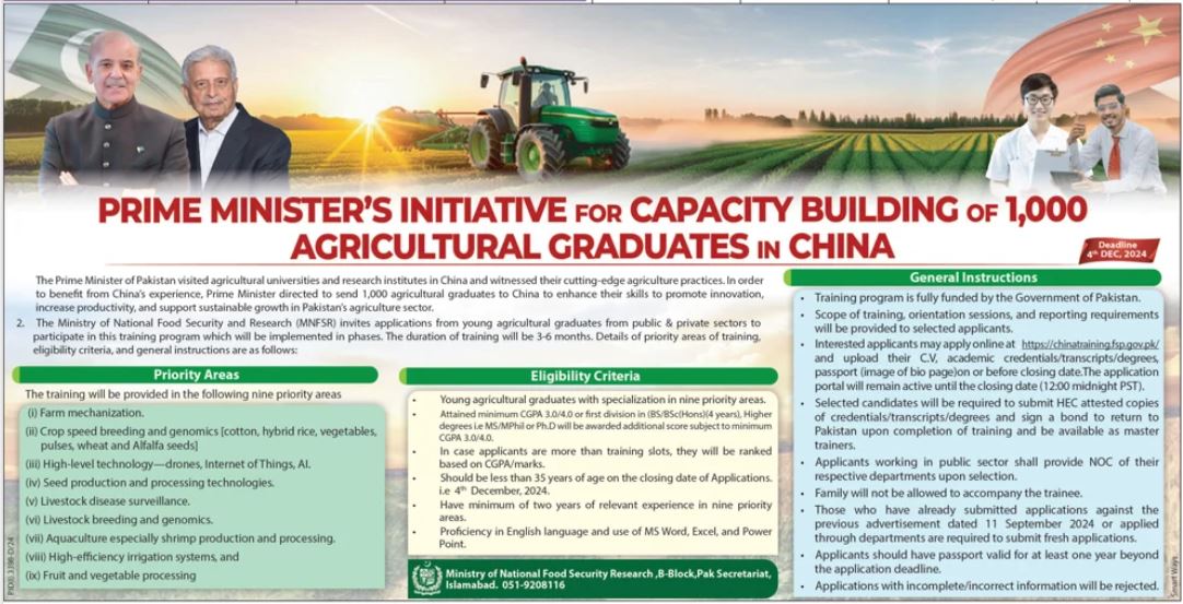 Latest Government jobs in Ministry of National Food Security & Research MNFSR in Management and others can be applied till 4 December 2024 or as per closing date in newspaper ad. Read complete ad online to know how to apply on latest Ministry of National Food Security & Research MNFSR job opportunities.